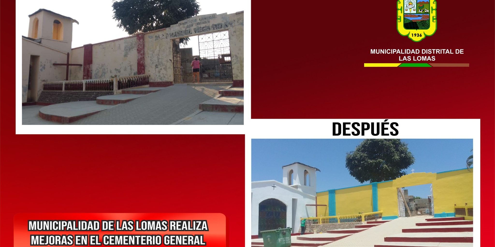 La Municipalidad Distrital de Las Lomas viene mejorando el Cementerio General Manuel Vega Roa para brindar un servicio de alta calidad a la comunidad que visita regularmente a sus seres queridos, como parte de este esfuerzo, se han llevado a cabo una serie de mejoras en estas instalaciones; Una de las mejoras notables es la renovaciΓ³n de la pintura, lo que ha mejorado significativamente la estΓ©tica del camposanto. Estas mejoras se han realizado en preparaciΓ³n para las prΓ³ximas festividades de Todos los Santos, cuando se espera una mayor afluencia de visitantes al cementerio.