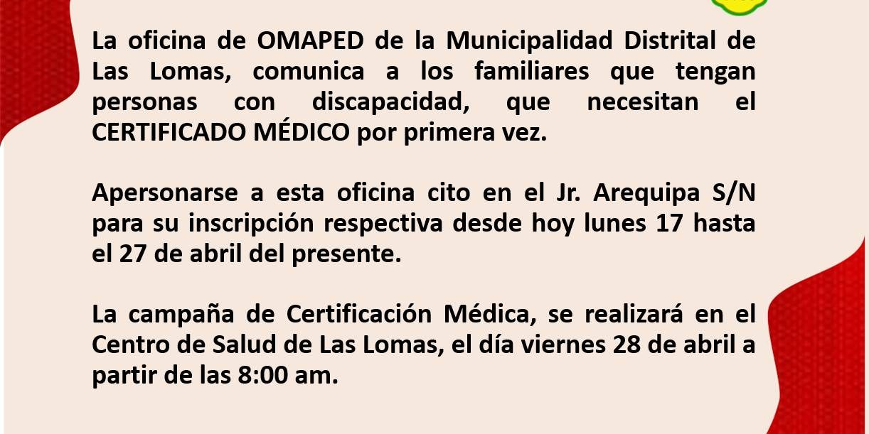 Abr172023Actividades#ATENCIÓN #Comunicado Campaña de Certificación Médica Inscribete en OMAPED #HOY #NuestroDesarrolloTareaDeTodo Compartir Share on FacebookShare on Facebook TweetShare on Twitter Share on LinkedInShare on LinkedIn TweetShare on Pinterest Share on WhatsAppShare on WhatsApp Navegación entre publicacionesAnteriorPublicación anterior:❗️MUNICIPALIDAD DE LAS LOMAS PREMIA TU PUNTUALIDAD‼️ Campaña del Impuesto Predial 2023SiguientePublicación siguiente:#EstamosContigo ❗️Municipalidad inicia campaña de actualización de padrón del SISFOH para beneficiarios de programas sociales‼️Noticias Relacionadas𝗧𝗔𝗟𝗟𝗘𝗥 𝗗𝗘 𝗣𝗥𝗜𝗢𝗥𝗜𝗭𝗔𝗖𝗜𝗢́𝗡 𝗗𝗘 𝗣𝗥𝗢𝗬𝗘𝗖𝗧𝗢𝗦 𝗣𝗔𝗥𝗔 𝗟𝗔𝗦 𝗟𝗢𝗠𝗔𝗦 𝗬 𝗕𝗢𝗦𝗤𝗨𝗘 𝗦𝗘𝗖𝗢10 abril, 2025𝐂𝐎𝐍 𝐇𝐈𝐃𝐑𝐎𝐉𝐄𝐓 𝐃𝐄 𝐄𝐏𝐒 𝐆𝐑𝐀𝐔 𝐒𝐎𝐋𝐔𝐂𝐈𝐎𝐍𝐀𝐍 𝐏𝐑𝐎𝐁𝐋𝐄𝐌𝐀́𝐓𝐈𝐂𝐀 𝐃𝐄 𝐂𝐎𝐋𝐀𝐏𝐒𝐎 𝐃𝐄 𝐃𝐄𝐒𝐀𝐆𝐔̈𝐄𝐒 𝐄𝐍 𝐋𝐀𝐒 𝐋𝐎𝐌𝐀𝐒10 marzo, 2025𝐃𝐢́𝐚 𝐍𝐚𝐜𝐢𝐨𝐧𝐚𝐥 𝐂𝐨𝐧𝐭𝐫𝐚 𝐥𝐚 𝐓𝐫𝐚𝐭𝐚 𝐝𝐞 𝐏𝐞𝐫𝐬𝐨𝐧𝐚𝐬23 septiembre, 2024MEJORAMIENTO Y ACTUALIZACIÓN DEL CATASTRO URBANO PARA CREACIÓN DEL PLAN DE DESARROLLO URBANO DEL DISTRITO DE LAS LOMAS11 septiembre, 2024𝐓𝐑𝐀𝐁𝐀𝐉𝐎𝐒 𝐃𝐄 𝐌𝐀𝐍𝐓𝐄𝐍𝐈𝐌𝐈𝐄𝐍𝐓𝐎 𝐃𝐄𝐋 𝐒𝐈𝐒𝐓𝐄𝐌𝐀 𝐃𝐄 𝐀𝐆𝐔𝐀 𝐏𝐎𝐓𝐀𝐁𝐋𝐄 𝐄𝐍 𝐇𝐔𝐀𝐂𝐇𝐔𝐌𝐀 𝐁𝐀𝐉𝐀 𝐀𝐕𝐀𝐍𝐙𝐀 𝐀𝐋 𝟓𝟎% 11 septiembre, 2024𝐂𝐀𝐏𝐀𝐂𝐈𝐓𝐀𝐍 𝐀 𝐓𝐑𝐀𝐁𝐀𝐉𝐀𝐃𝐎𝐑𝐄𝐒 𝐌𝐔𝐍𝐈𝐂𝐈𝐏𝐀𝐋𝐄𝐒11 septiembre, 2024