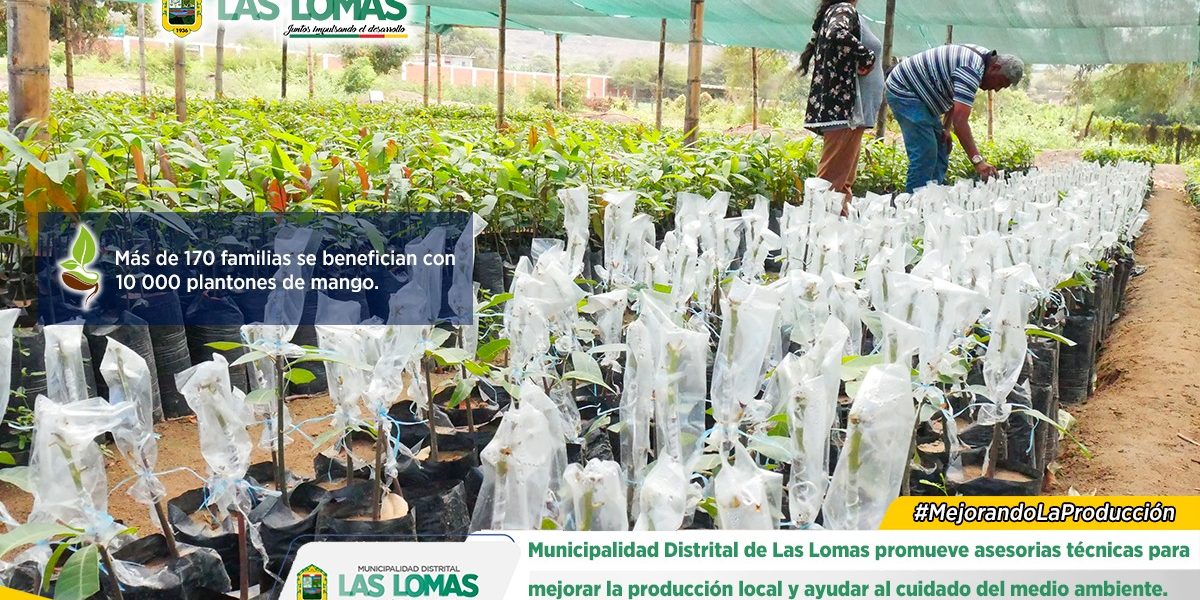 Más de 170 padres de familia de la I.E. José María Arguedas, del centro poblado Pampa Elera, en el Valle de Chipillico, se benefician con la producción de 10 mil plantones de mango, que promueve la Municipalidad Distrital de Las Lomas para mejorar la producción local y ayudar al cuidado del medio ambiente.
