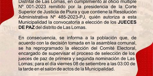 Se hace extensiva la invitaciรณn a las autoridades, dirigentes de base, lรญderes y pรบblico en general a unirse a esta asamblea; reprogramada para el dรญa viernes 08 de setiembre que se realizarรก en el salรณn de actos de la Municipalidad Distrital de Las Lomas, para conformar el comitรฉ electoral quiรฉn elegirรก a los nuevos Jueces de Paz.