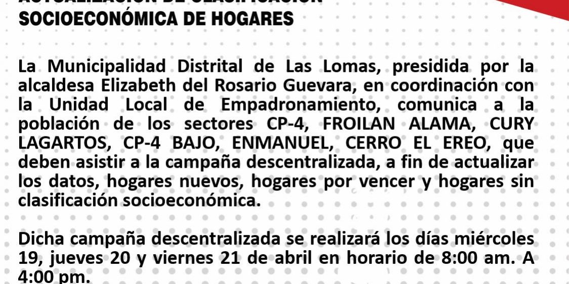 Abr142023Actividades#Atención CP 4 Froilan Alama Cury Lagartos CP 4 Bajo Enmanuel Cerro El Ereo #CampañaDescentralizada #NuestroDesarrolloTareaDeTodo Compartir Share on FacebookShare on Facebook TweetShare on Twitter Share on LinkedInShare on LinkedIn TweetShare on Pinterest Share on WhatsAppShare on WhatsApp Navegación entre publicacionesAnteriorPublicación anterior:Villa Independiente #CampañaDescentralizadaSiguientePublicación siguiente:❗️GANADEROS DE LAS LOMAS SE BENEFICIAN CON PROYECTO DE INSEMINACIÓN ARTIFICIAL EN GANADO VACUNO‼️Noticias Relacionadas𝗧𝗔𝗟𝗟𝗘𝗥 𝗗𝗘 𝗣𝗥𝗜𝗢𝗥𝗜𝗭𝗔𝗖𝗜𝗢́𝗡 𝗗𝗘 𝗣𝗥𝗢𝗬𝗘𝗖𝗧𝗢𝗦 𝗣𝗔𝗥𝗔 𝗟𝗔𝗦 𝗟𝗢𝗠𝗔𝗦 𝗬 𝗕𝗢𝗦𝗤𝗨𝗘 𝗦𝗘𝗖𝗢10 abril, 2025𝐂𝐎𝐍 𝐇𝐈𝐃𝐑𝐎𝐉𝐄𝐓 𝐃𝐄 𝐄𝐏𝐒 𝐆𝐑𝐀𝐔 𝐒𝐎𝐋𝐔𝐂𝐈𝐎𝐍𝐀𝐍 𝐏𝐑𝐎𝐁𝐋𝐄𝐌𝐀́𝐓𝐈𝐂𝐀 𝐃𝐄 𝐂𝐎𝐋𝐀𝐏𝐒𝐎 𝐃𝐄 𝐃𝐄𝐒𝐀𝐆𝐔̈𝐄𝐒 𝐄𝐍 𝐋𝐀𝐒 𝐋𝐎𝐌𝐀𝐒10 marzo, 2025𝐃𝐢́𝐚 𝐍𝐚𝐜𝐢𝐨𝐧𝐚𝐥 𝐂𝐨𝐧𝐭𝐫𝐚 𝐥𝐚 𝐓𝐫𝐚𝐭𝐚 𝐝𝐞 𝐏𝐞𝐫𝐬𝐨𝐧𝐚𝐬23 septiembre, 2024MEJORAMIENTO Y ACTUALIZACIÓN DEL CATASTRO URBANO PARA CREACIÓN DEL PLAN DE DESARROLLO URBANO DEL DISTRITO DE LAS LOMAS11 septiembre, 2024𝐓𝐑𝐀𝐁𝐀𝐉𝐎𝐒 𝐃𝐄 𝐌𝐀𝐍𝐓𝐄𝐍𝐈𝐌𝐈𝐄𝐍𝐓𝐎 𝐃𝐄𝐋 𝐒𝐈𝐒𝐓𝐄𝐌𝐀 𝐃𝐄 𝐀𝐆𝐔𝐀 𝐏𝐎𝐓𝐀𝐁𝐋𝐄 𝐄𝐍 𝐇𝐔𝐀𝐂𝐇𝐔𝐌𝐀 𝐁𝐀𝐉𝐀 𝐀𝐕𝐀𝐍𝐙𝐀 𝐀𝐋 𝟓𝟎% 11 septiembre, 2024𝐂𝐀𝐏𝐀𝐂𝐈𝐓𝐀𝐍 𝐀 𝐓𝐑𝐀𝐁𝐀𝐉𝐀𝐃𝐎𝐑𝐄𝐒 𝐌𝐔𝐍𝐈𝐂𝐈𝐏𝐀𝐋𝐄𝐒11 septiembre, 2024