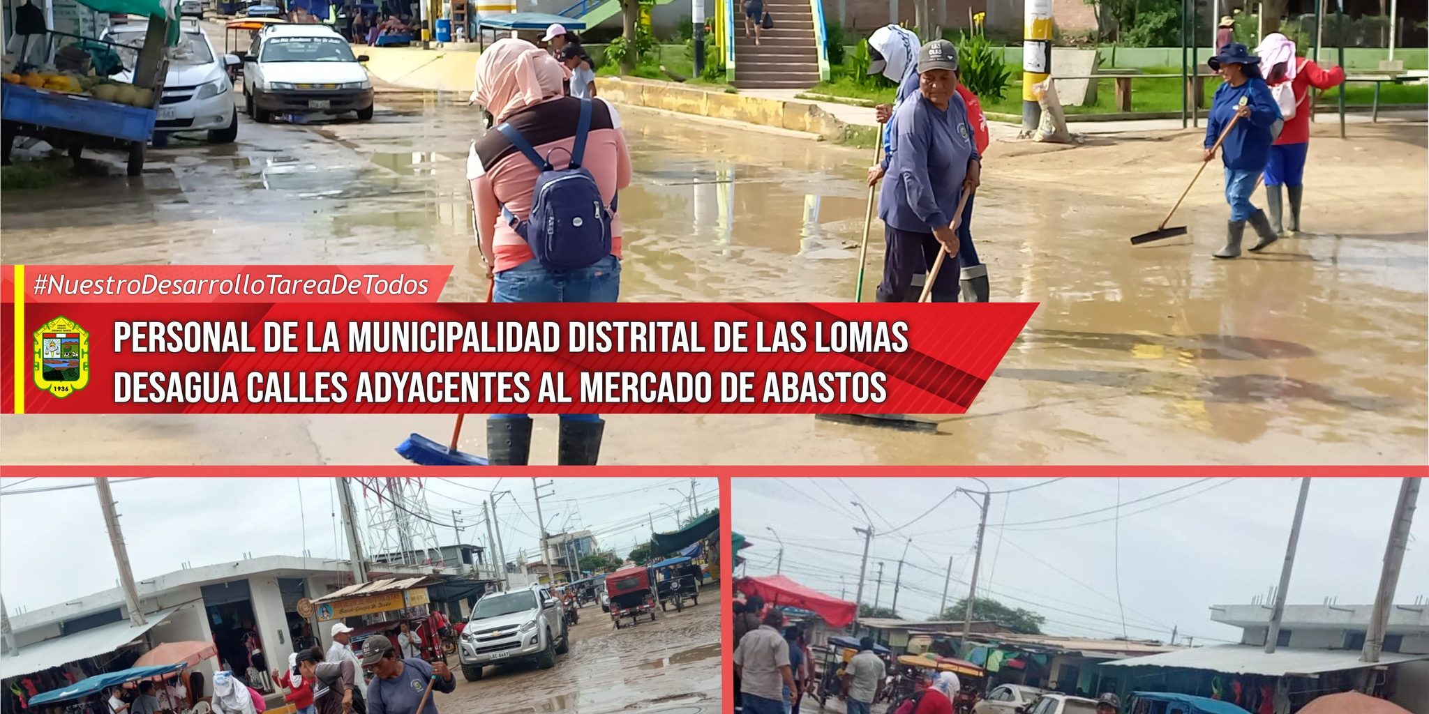 Actuando de manera rΓ‘pida y diligente en procura del bienestar ciudadano, personal de la Gerencia de Comunales y Medio ambiente de la Municipalidad Distrital de Las Lomas continΓΊa realizando la limpieza total y desaguando las calles adyacentes al mercado de abastos de nuestro distrito de Las Lomas.